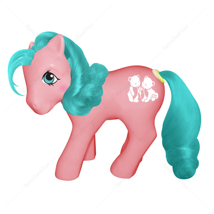 Tossles is a beautiful pony with a coral pink body and stunning aqua-colored mane and tail, creating a vibrant yet harmonious color combination. Her symbol features two white bears, giving her a cozy and cuddly theme that makes her stand out among the Happy Tails Ponies. The contrast of her soft coral pink body with the cool aqua hair gives her a unique and eye-catching look, while the white bears in her symbol add a charming and gentle touch. As with the other ponies in this series, her tail spins when activated, adding to the interactive fun.