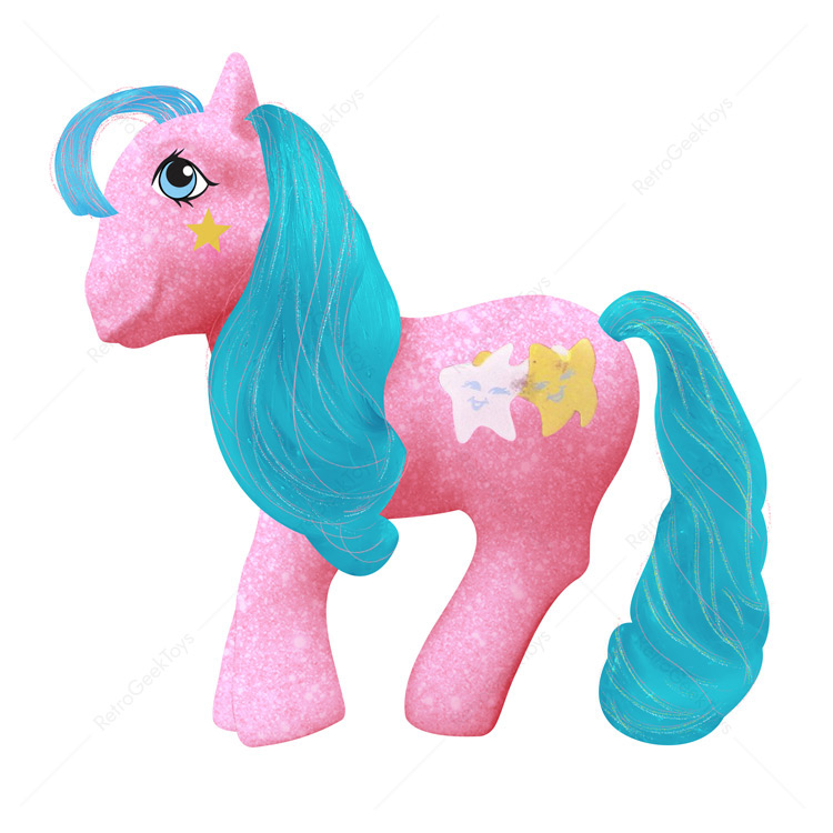 Stardancer is an enchanting Sparkle Pony with a translucent pink body that sparkles with embedded glitter, reminiscent of a dreamy sunset. Her blue mane and tail, adorned with shimmering tinsel, provide a striking contrast, enhancing her ethereal beauty. Her symbol features a yellow star with a white trail, symbolizing her graceful movements across the night sky. Stardancer captivates with her elegance, inspiring dreams and wonder.