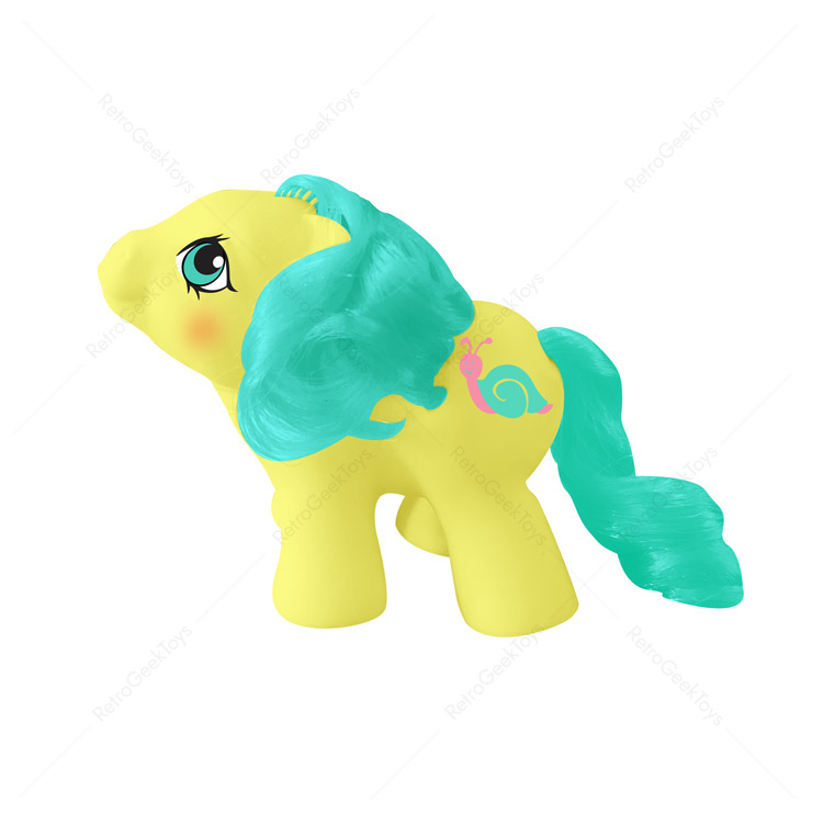 With her sunny yellow body and soft green mane, Squirmy looks like a tiny ray of sunshine. Her green eyes are filled with wonder as she watches the world around her, always eager to explore new things at her own pace. Her symbol, a pink and green snail, represents her love for little creatures and her patient, gentle nature. She enjoys tracing patterns in the sand, playing in the grass, and watching snails slowly make their way across the garden.