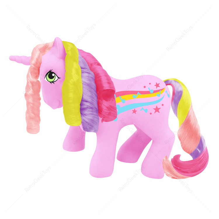 Streaky is a lively and creative pony whose heart beats to the rhythm of music and color. Her rich purple body glows with energy, while her beautifully curled mane—featuring fading pink, yellow, deep pink, and purple—twists like the melody of a happy song. Her symbol, a bright rainbow accompanied by blue music notes and pink stars, reflects her love for rhythm, movement, and artistic expression. With twinkling green eyes, she is always ready to dance, sing, and brighten the world with her presence.