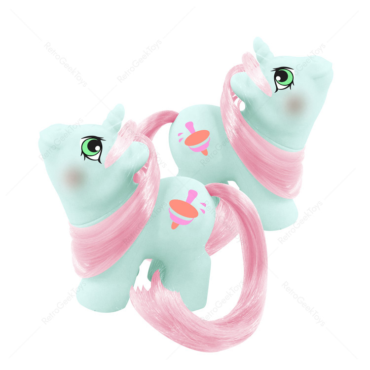 The Newborn Twin Ponies were introduced by Hasbro in Year 6 (1987-1988) as part of the Generation 1 My Little Pony line. These charming pairs were designed to resemble infant ponies, each set featuring unique color schemes and symbols. They were sold in pairs.