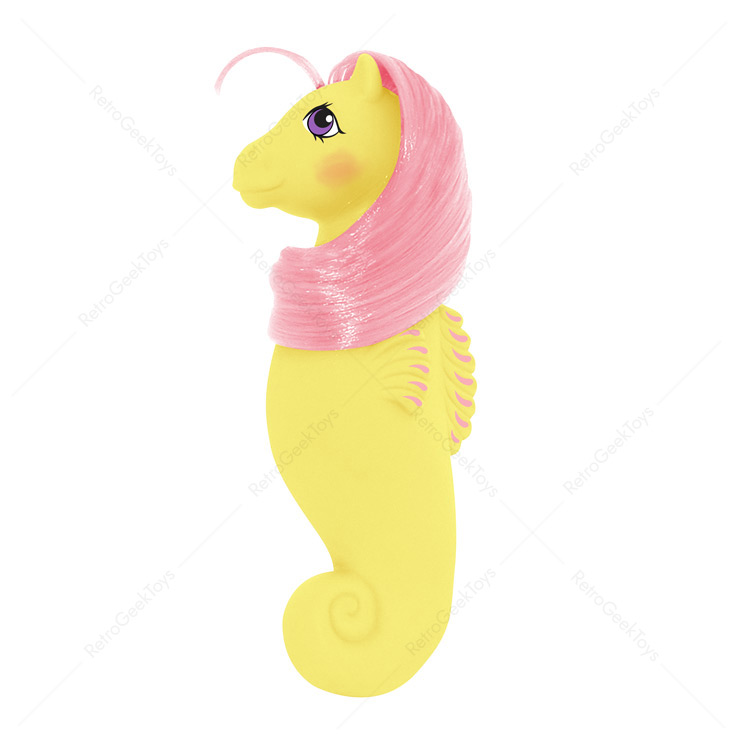 High Tide is a vibrant G1 Sea Pony introduced in 1984, bringing the sunny warmth of the seaside to the My Little Pony collection. Her bright yellow body and soft, curly light pink hair create a cheerful and eye-catching design.